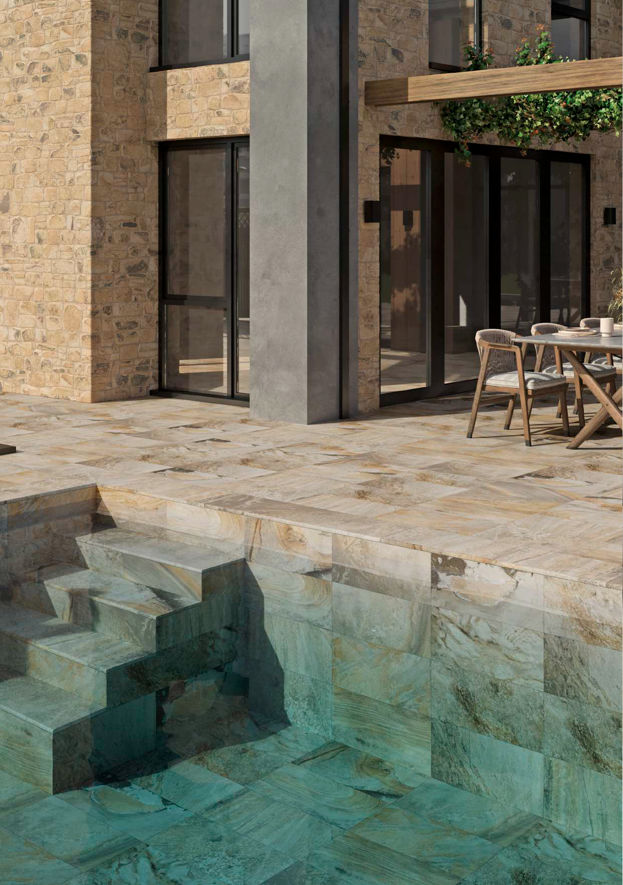 La série Cati Extérieur permet de créer des espaces extérieurs harmonieux et fonctionnels. L’aspect pierre apporte un caractère authentique tout en conservant les performances techniques du grès cérame.