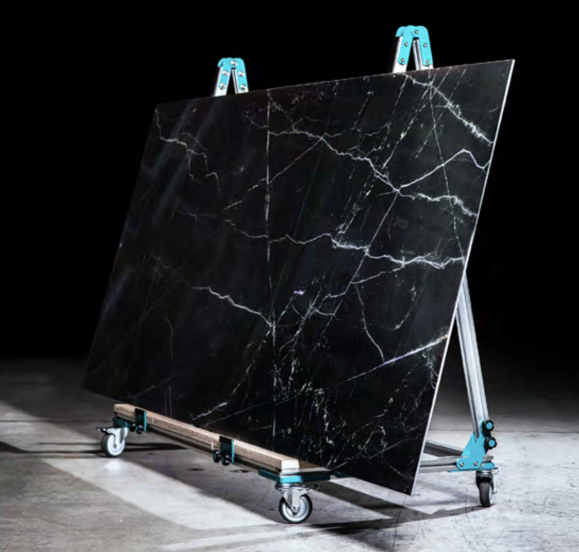 Chevalet mobile conçu pour le déplacement et le double encollage des dalles grands formats. Châssis stable avec 4 roulettes en caoutchouc verrouillables et pattes latérales compatibles avec les châssis de transport grands formats. Convient aux carreaux jusqu’à 3,2 × 1,6 m, capacité de charge maximale 280 kg.