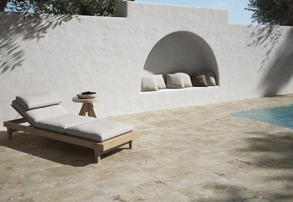 L’aspect travertin apporte une ambiance minérale et naturelle, tout en bénéficiant des performances techniques du grès cérame. Le format 30 × 60 permet une pose flexible et s’adapte facilement aux contraintes des espaces extérieurs.
