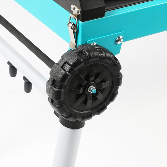 Établi tout-en-un pouvant être utilisé comme chariot à roulettes. Hauteur de travail réglable, plateau avec marquage pour coupes à 0° et 180°, poignée et roues pour un transport facile. Convient aux travaux de coupe, perçage, polissage et au transport de matériel. Capacité de charge 200 kg.