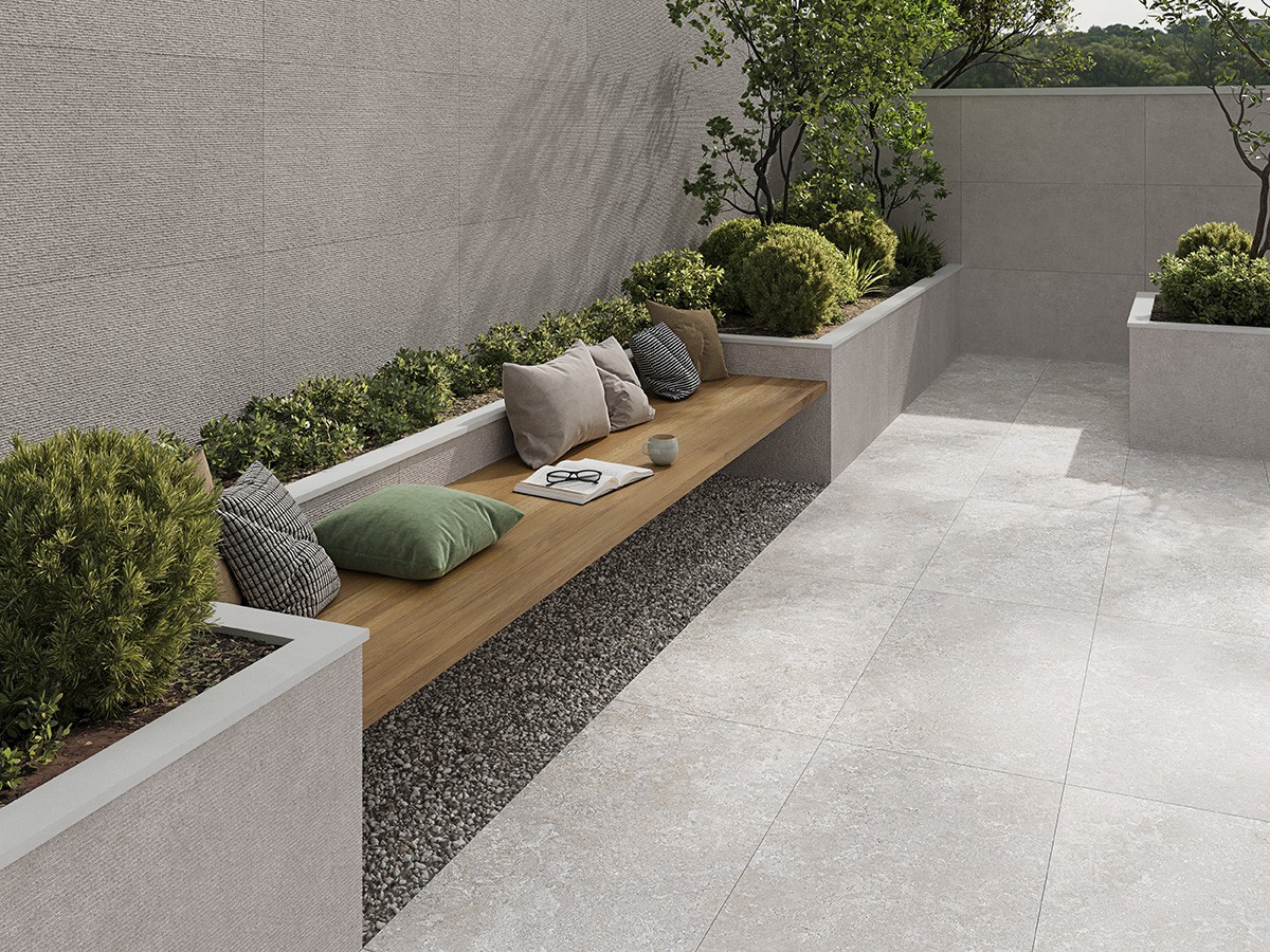 Pour un rendu équilibré, associer la série Flavia à des matériaux naturels tels que le bois ou la pierre, et à un mobilier extérieur aux lignes sobres. Les formats grands carreaux réduisent les joints et renforcent l’effet de continuité visuelle.