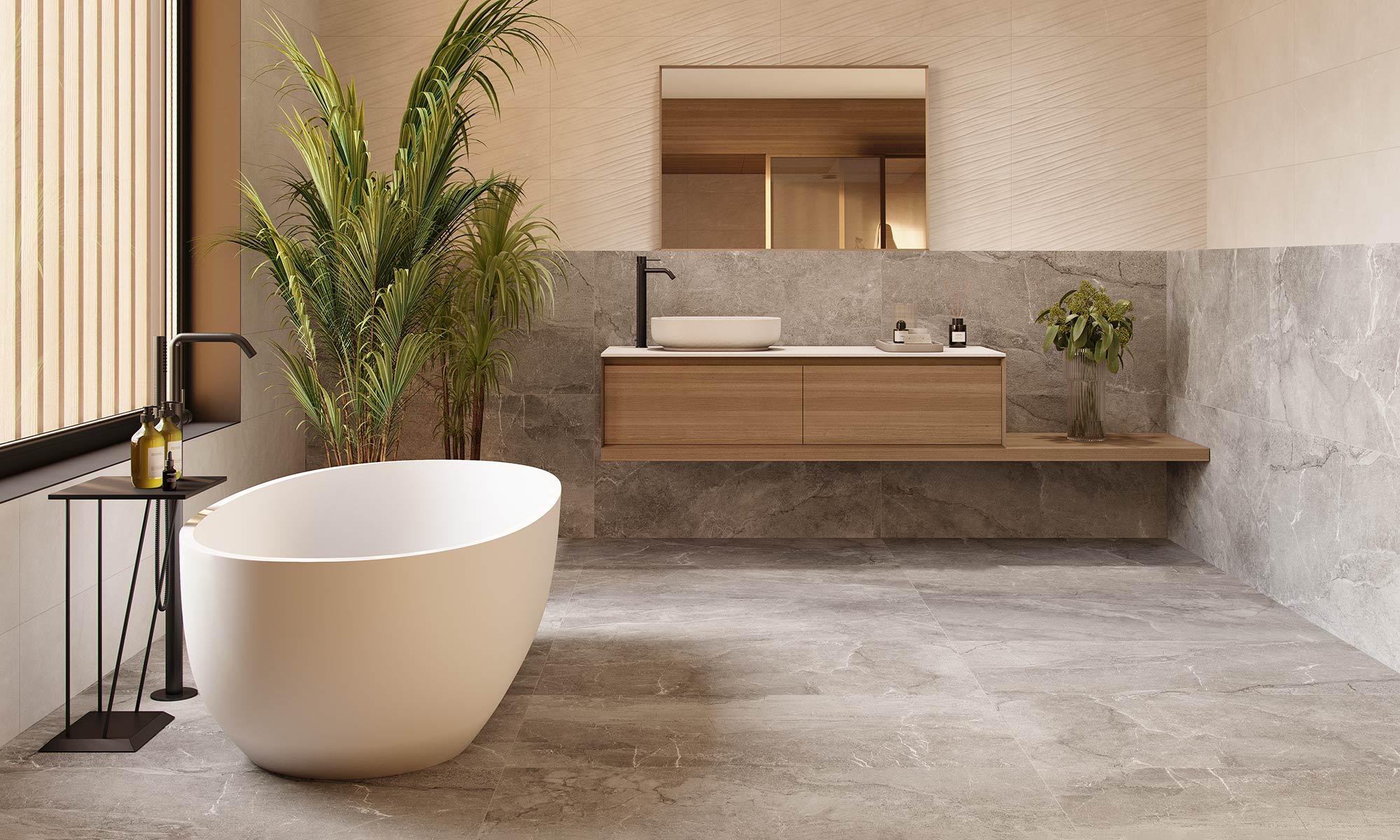 Déclinée en format 60 x 120 cm, la série DIVERSO permet de créer des surfaces harmonieuses et modernes, tout en limitant les joints grâce à ses bords rectifiés. La finition mate renforce l’aspect naturel du matériau et assure un excellent confort visuel, sans reflets excessifs.